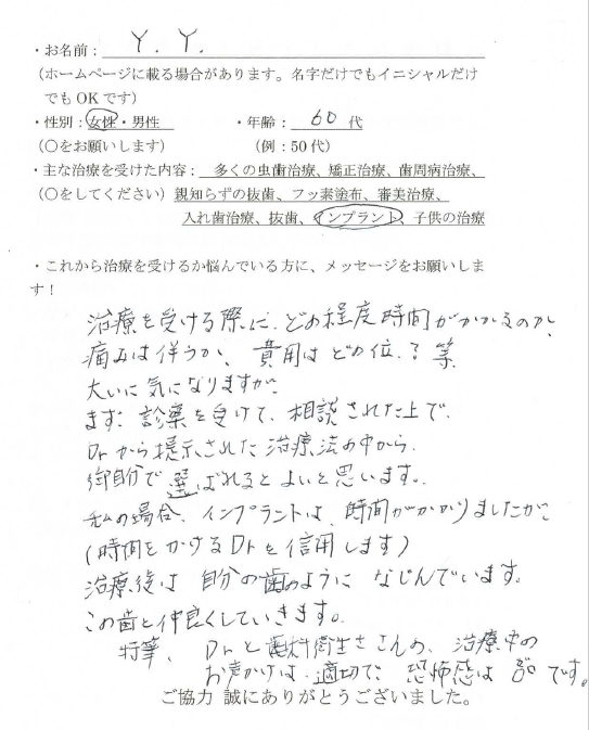 2021年11月6日 / 最終更新日時 : 2021年11月26日 Design07 Y.Y様 60歳代 女性 治療を受ける際に、どの程度の時間がかかるのか、痛みは伴うか、費用はどの位? 等、大いに気になりますが、まず、診療を受けて、相談された上で、Drから提示された治療法の中から御自分で選ばれるとよいと思います。 私の場合、インプラントは時間がかかりましたが(時間をかけるDrを信用します)、治療後は自分の歯のようになじんでいます。 この歯と仲良くしていきます。 特筆、Drと歯科衛生士さんの、治療中のお声かけは、適切で、恐怖感は0ぜロです。