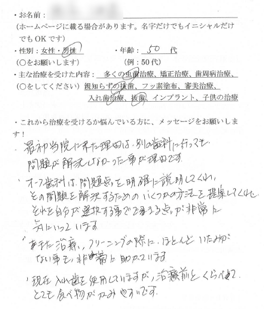 ・オーク歯科は問題点を明確に説明してくれ、その問題を解決するためのいくつかの方法を提案してくれ、それを自分が選択する事できる点が非常に気にいっています。