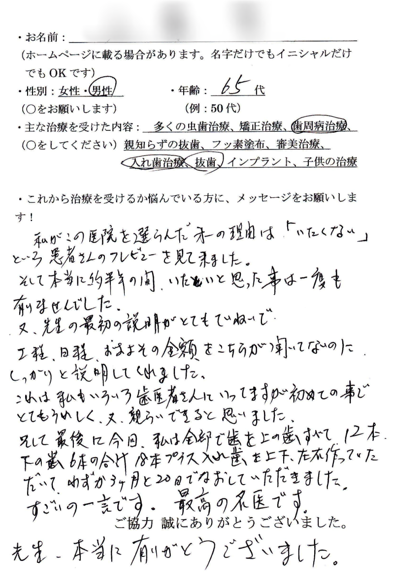 そして最後の今日、私は全部で歯を上の歯すべて12本、下の歯6本の合計18本プラス入れ歯を上下左右作っていただいて、わずか3か月と20日でなおしていただきました。