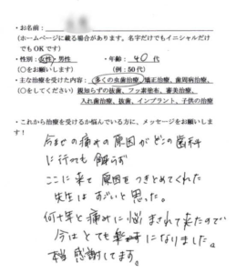今までの痛みの原因がどこの歯科に行っても解らず、ここに来て原因をつきとめてくれた先生はすごいと思った。