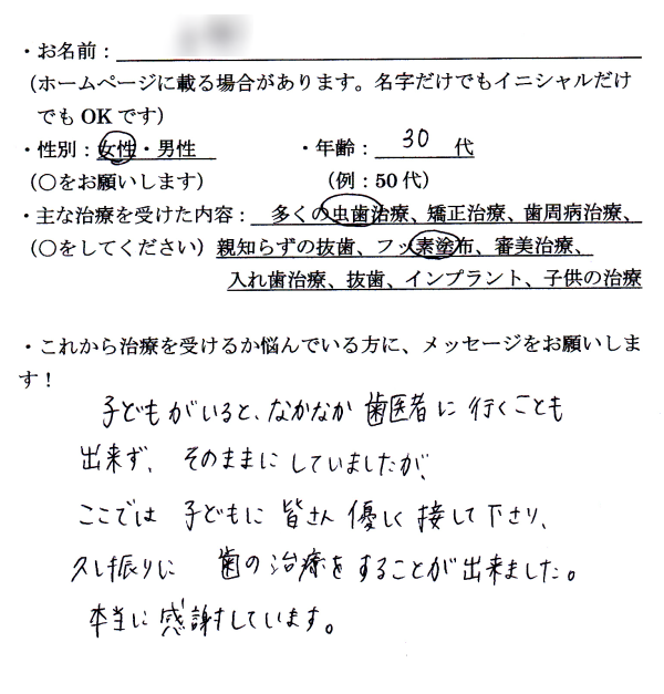 2021年11月23日 / 最終更新日時 : 2021年11月26日 Design07 U様 30歳代 女性 子供がいるとなかなか歯医者に行くことも出来ず、そのままにしていましたが、ここでは子供に皆さん優しく接して下さり、久し振りに歯の治療をすることが出来ました。 本当に感謝しています。