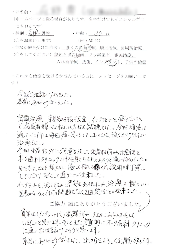 費用は(インプラント代)高額ですが、大切にお手入れしていきたいと思います。そしてまた定期的にオーク歯科クリニックに通いお世話になろうと思います。