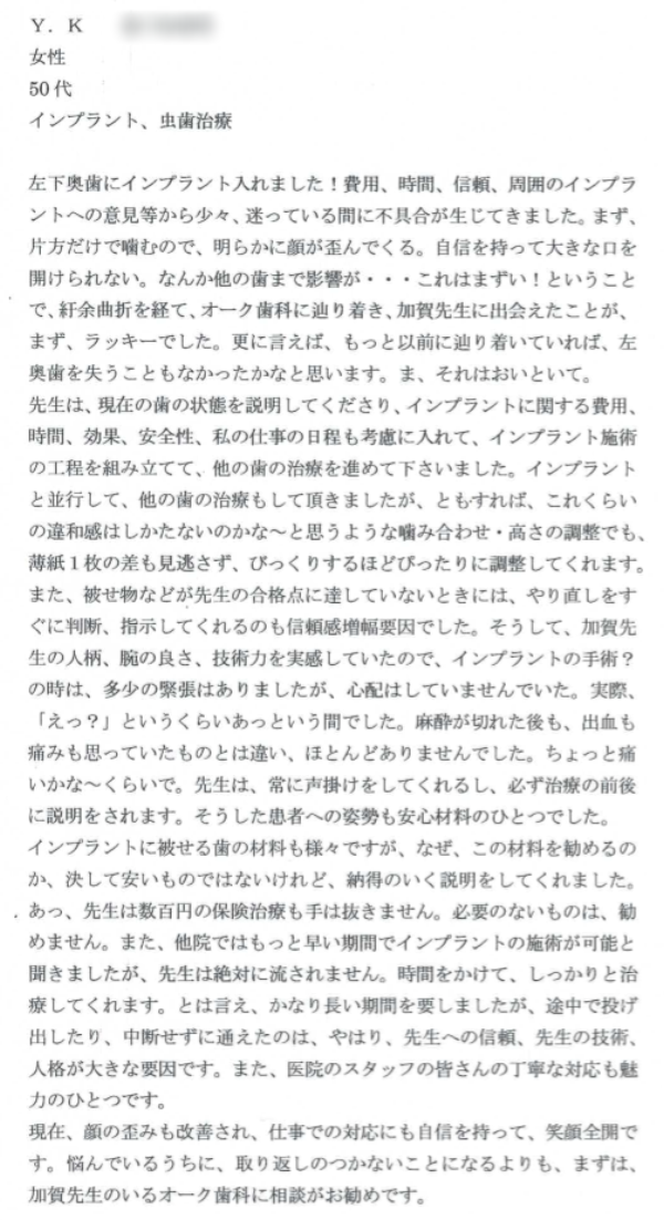 また、被せ物などが先生の合格点に達していないときには、やり直しをすぐに判断、指示してくれるのも信頼感増幅要因でした。そうして、加賀先生の人柄、腕の良さ、技術力を実感していたので、インプラントの手術?の時は、多少の緊張はありましたが、心配はしていませんでした。実際、「えっ?」というくらいあっという間でした。麻酔が切れた後も、出血も痛みも思っていたものとは違い、ほとんどありませんでした。ちょっと痛いかな~くらいで。先生は、常に声掛けしてくれるし、必ず治療の前後に説明をされます。そうした患者への姿勢も安心材料のひとつでした。